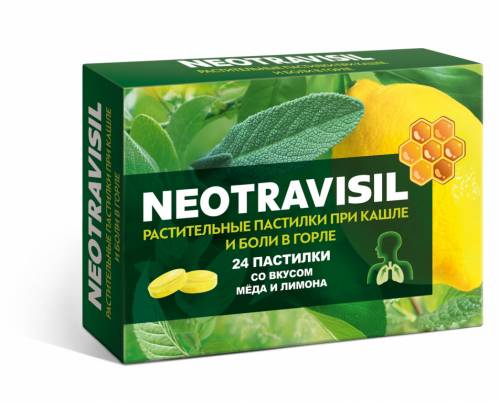 NEOTRAVISIL уникален тем, что содержит инновационную комбинацию экстрактов лекарственных растений: солодки, эвкалипта, камфоры, апельсина и мяты, которые обеспечивают двойное действие: помогают при кашле и боли в горле.